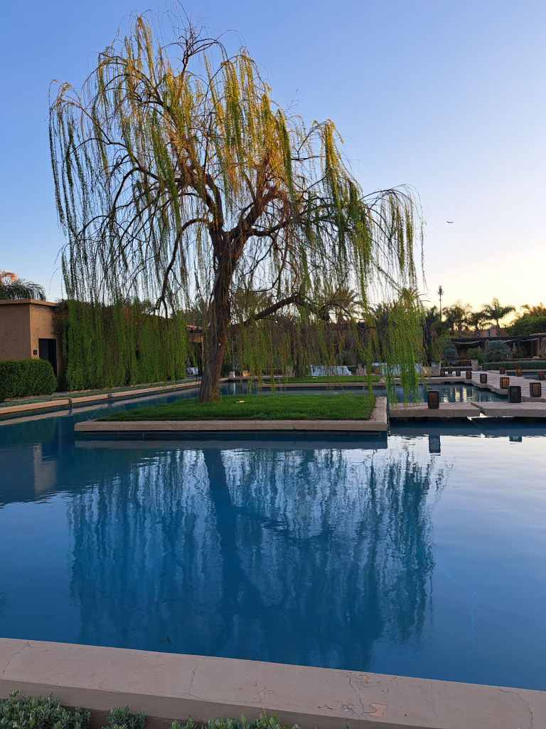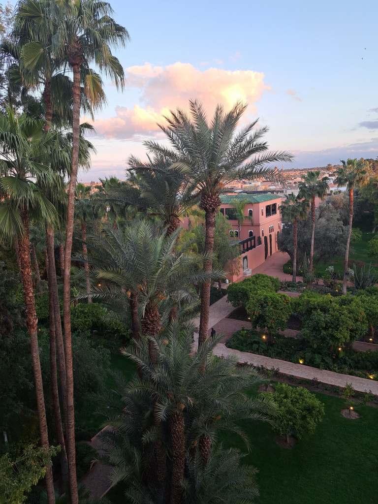 Gut gestärkt fuhren wir zum The Oberoi Marrakech. Schon die ockerfarbene Architektur im Kontrast zur grünen Gartenanlage lässt jeden Stress sofort abfallen.